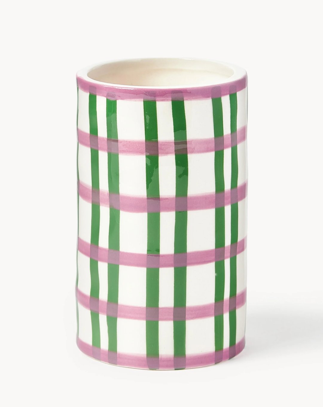 Verleihen Sie Ihrem Zuhause mit dieser karierten Vase einen Farbtupfer und ein ansprechendes Muster. Sie hat die perfekte Größe für kleine Blumen oder zur Aufbewahrung von Küchenutensilien.